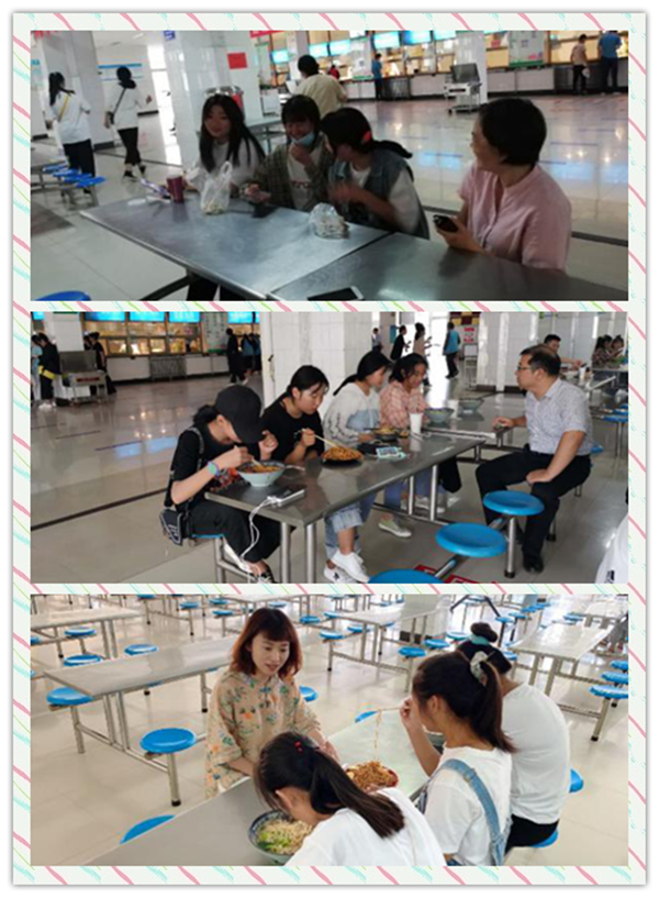 班主任与新生共同就餐,在轻松的就餐氛围中,了解他们一日三餐的消费情况和就餐感受,与学生在学习、心理、情感等话题进行直接的交流沟通,充分拉近师生间的距离,消除心理隔阂,在最轻松的环境中了解学生的想法和需求,有针对性的解决学生遇到的问题。