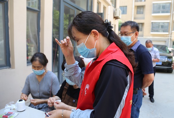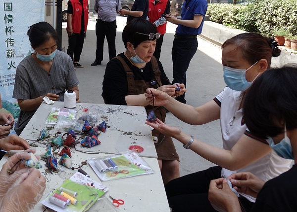 活动现场,大家有说有笑,其乐融融,处处洋溢着浓郁的节日氛围。“先拿粽叶把它卷起来,窝成一个三角,这样米就不会漏出来……”,老同志们分享着包粽子的经验,互相搭档配合,一边包粽子,一边进行热烈交流。萋萋苦艾纳香囊,传承千年未泯香。现场还准备了香囊制作材料——布料、艾草、挂绳、针线包等,大家兴致盎然,纷纷穿针引线,认细心地缝制着各式各样的香囊。