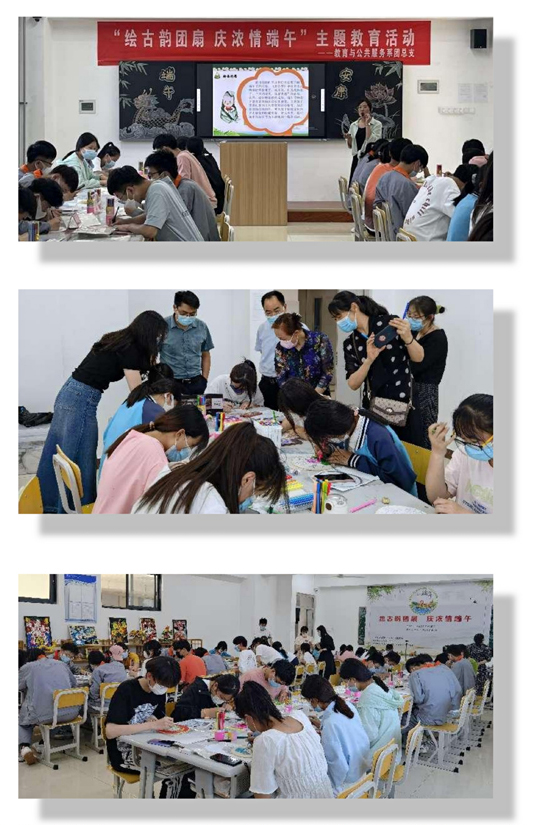 由教育与公共服务系承办的“绘古韵团扇,庆浓情端午”主题教育活动在高铁新区校区如约举行。“庶动清风,以增美德”,端午赠扇相沿成俗。端午节赠扇子体现了儒家仁爱的文化价值和社会价值,倡导学子崇德向善,更加坚定我们的文化自信。现场参与绘团扇活动的师生超过百人,居家学生通过线上直播的形式与现场积极互动,感受浓韵的气氛。活动现场由徐晓洁教师进行讲授,从课程引入,绘画构思,绘画材料,范作分解四个方面进行讲解。学生们热情高涨,挥洒画笔,在洁白的绢布扇面上描绘出一个个生动形象的画作,有画卡通粽子的、有画龙舟的、有画荷花的……一把把扇子在大家挥毫之间变得妙趣横生、摇曳多姿。