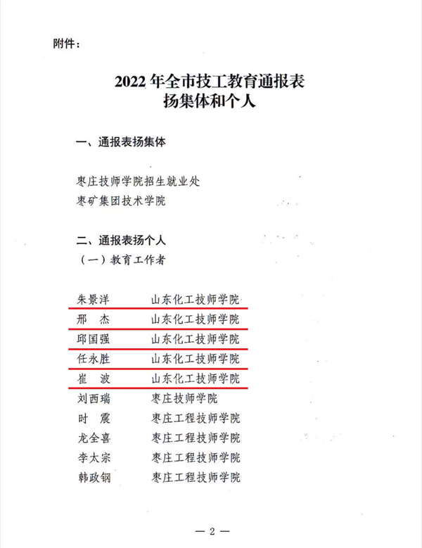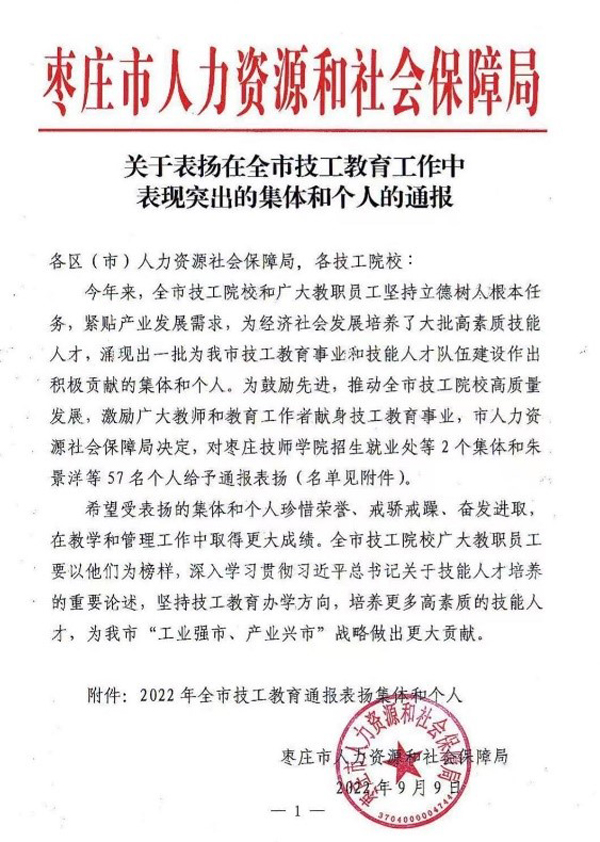 近日,枣庄人力资源和社会保障局下发《关于表扬在全市技工教育工作中表现突出的集体和个人的通报》。我院20名教师喜获通报表扬。