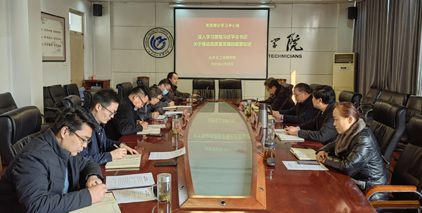 2月28日下午,学院党委书记孙晋东在学院路校区会议室主持召开党委理论学习中心组专题学习会议,深入学习贯彻习近平总书记关于推动高质量发展的重要论述,党委副书记、院长王庆杰,党委副书记苏军生,党委委员、副院长张艳、崔世玉,党委委员、纪委书记苏友华参加学习,理论学习中心组学习秘书朱景洋、段亚锋、徐廷国、戴雪列席会议。
