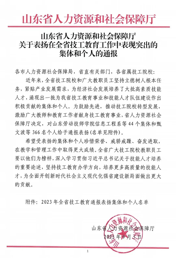 近日,山东省人力资源和社会保障厅印发《关于表扬在全省技工教育工作中表现突出的集体和个人的通报》,我院集体以及3名教师赫然在列,获通报表扬。