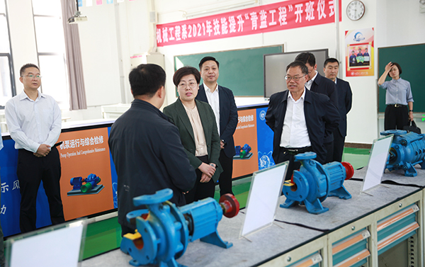 李妍一行实地参观了学院机械工程系、化学工程系、工业分析与检测系实训室,化工生产实训中心、世界技能大赛中国集训基地、化工安全与应急救援实训基地。现场听取了学院新校区建设、实训基地运行、实习设备功能、高技能人才培养、承办赛事、毕业生就业、技能培训、党建活动阵地建设等情况的详细介绍。李妍对学院坚持党建引领,深耕化工特色高质量办学、高质量就业给予高度评价,并对学院深入开展政、校、企深度合作提出了建设性的实施意见。