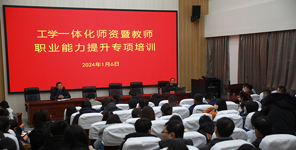 1月6日至7日,学院工学一体化师资暨教师职业能力提升专项培训在高铁新区校区报告厅举行,江苏常州技师学院周晓峰、杨琼教授受邀主讲。副院长崔世玉出席培训会议,教务处、教研督导处、各系部负责人,各教研室主任、45岁以下专职教师参加培训,教务处处长任永胜主持会议。