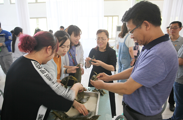 现场气氛活跃,师生积极踊跃参加活动,泡好糯米、洗干净红枣、冲洗好粽叶,剪好扎绳,前期工作准备好后,同学们都跃跃欲试地要尝试,大家迅速地围到技术娴熟的老师周围,观看具体步骤,要未成漏斗状,裹好,扎线系结实,预防漏米,在老师的现场演示下,同学们开始动手折粽叶、填糯米、裹叶、扎线,一个棱角分明的粽子成型了,虽然有的歪歪扭扭,形状各异,有的“有点颜值担当”,在相互切磋中,一串串粽子包好了,看着第一次成功的作品,期待着煮熟之后应该是最香最甜的,想到这些同学们都开心极了。