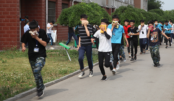 警笛声一响,伴着急促的哨音,在教室上自习课的同学、在宿舍休息的同学,迅速收拾好自己的随身物品,携带好湿毛巾,离开位置,按照预先设计好的疏散路线,快速而又有秩序地到空旷地集合,5分钟的时间内,各院系、各楼层同学一个也没有掉队。