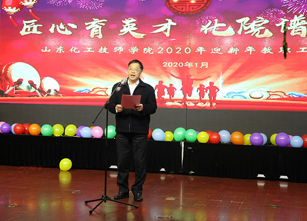 党委书记孙晋东联欢会开幕式上致辞,孙书记指出,2019年学院创新发展,收获颇丰,我院被批准为第45届世界技能大赛化学实验室技术项目中国集训基地;李华健同学代表中国参加第45届世界技能大赛,并获得优胜奖,实现了我院学子跨出国门,走向世界的突破;招生数量和在校生规模取得历史性突破;成功承办了第一届山东省危险化学品应急救援技术技能竞赛,社会服务能力显著增强;国家开放大学石油化工学院本科教学点获得批准;先后荣获“全省技工教育先进集体”“全省教育系统先进集体”“山东最佳社会声誉高校”荣誉称号,对全体教职工的辛勤耕耘和无私奉献表示感谢。