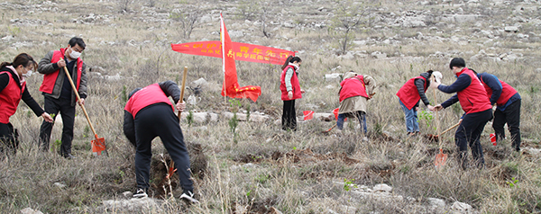 大家一到植树现场,就带着铁锨、水桶等工具忙碌开了,在林业和绿化局技术人员的指导下,大家严格按照植树技术规范,分工协作,挖坑、扶苗、填土、踩实、浇水……各个环节衔接有序,一丝不苟,经过2个多小时紧张劳动,共栽植黄栌等绿化苗木100余棵。一棵棵新栽的苗木,在明媚的春光中展现出勃勃生机,为活动现场山体生态修复增添了绿意。