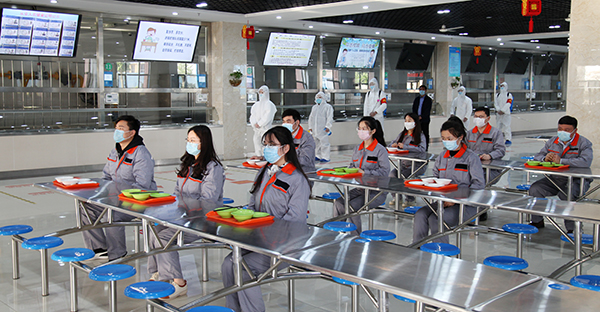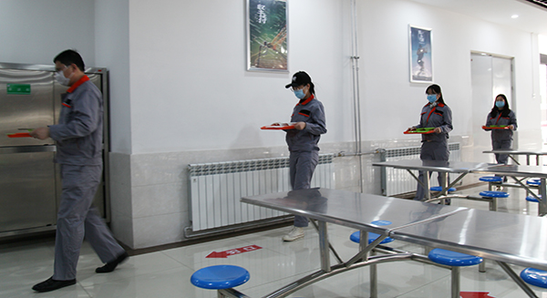 学生以班级为单位,由班主任带领,间隔1.5米带至餐厅排队测温后进入餐厅,排队洗手消毒后,排队到班级就餐位置,就餐座次按照单人单桌,同向就餐原则就坐,出入餐厅按照单向流动,错峰就餐,确保在安全距离情况下300余人同时就餐。