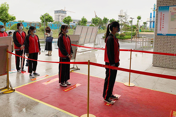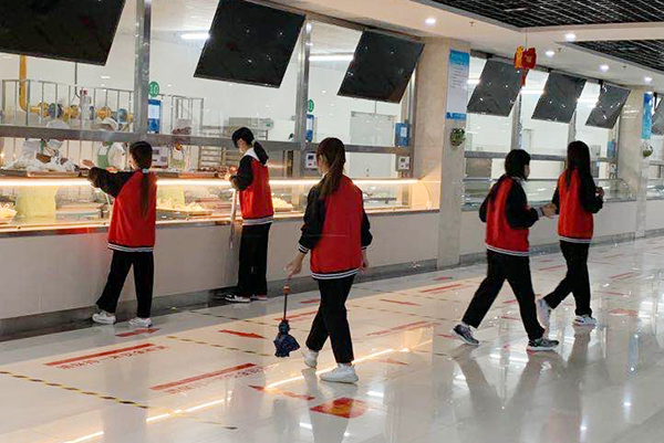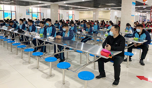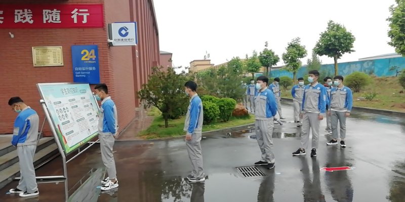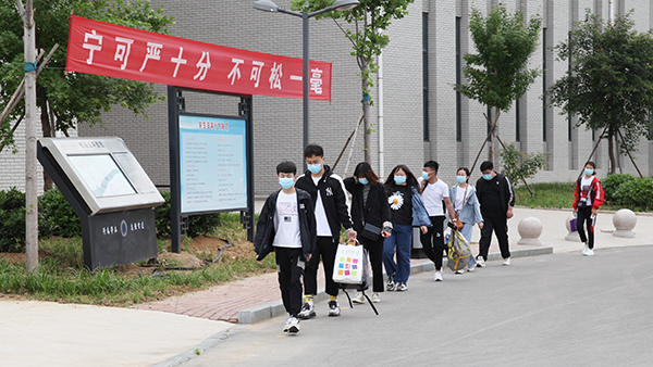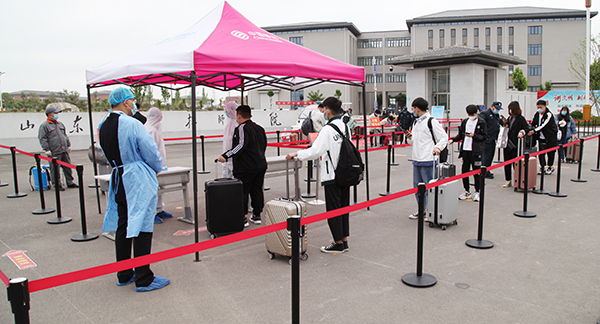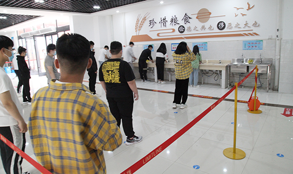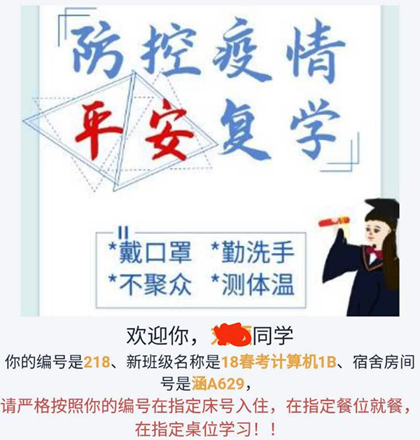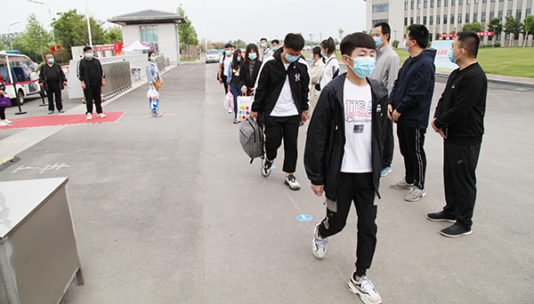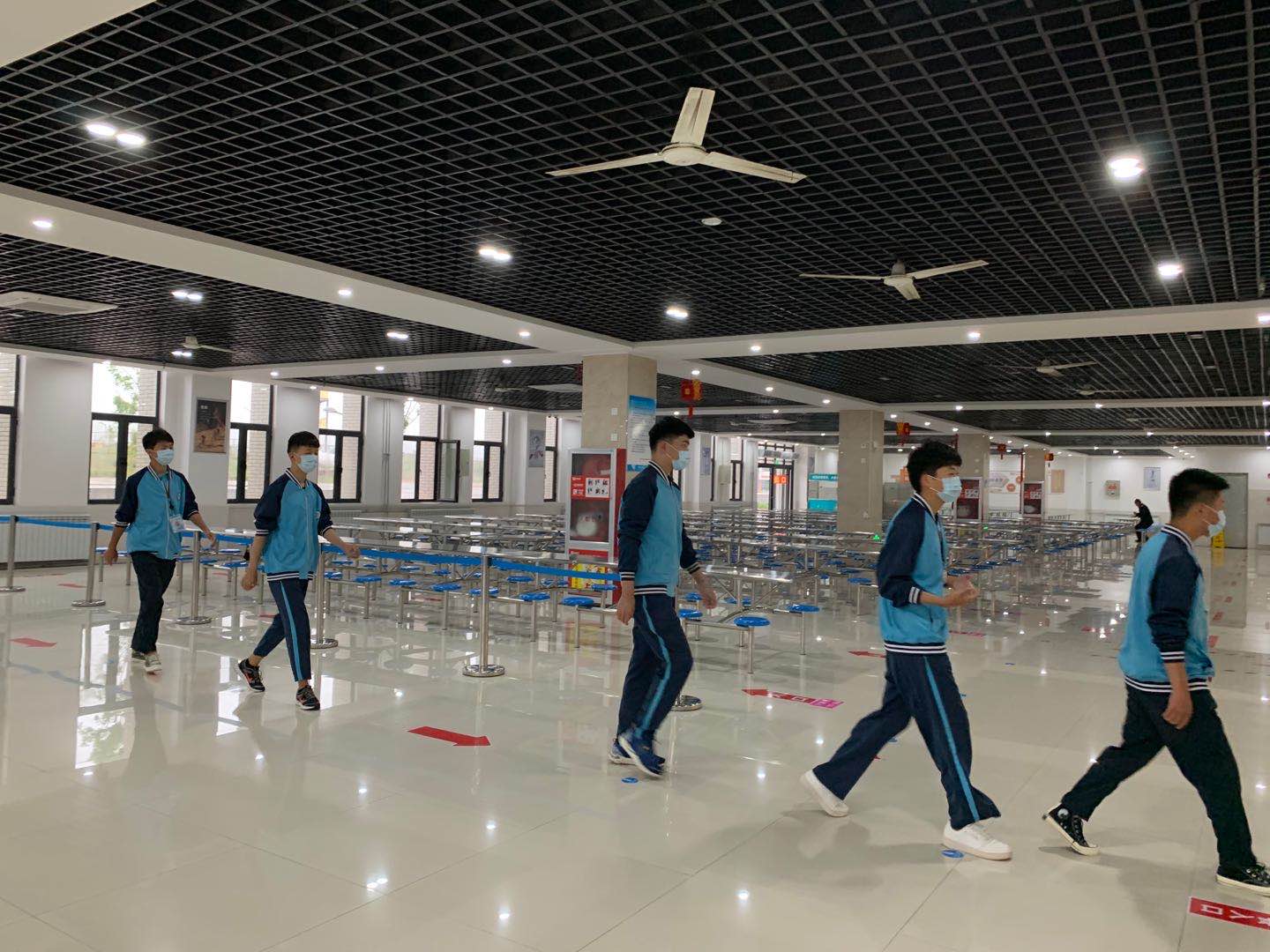 “请各位家长不要停留,即停即走。”在现场工作人员的提示下,学生们自觉佩戴口罩、携带自己的行李,步入学生入校安全通道,自觉排队体温检测、显示健康码、扫码核实班级、男女生分开存放行李、手部消毒、更换口罩,间隔1.5米,列队进入校园,在宿舍外行李集中存放点,领取行李,经过宿管员检测进入宿舍。宿舍按照四人间标准住宿,同学们收拾好床铺,在班主任老师的带领下,分批次到餐厅就餐,就餐按照班级列队入座就餐,单人单桌、同向就餐,餐后列队离开餐厅。以班级为单位,人与人间隔1.5米,校园列队行走;进入教学楼,接受班主任老师的晨午晚测温后,间隔列队进入教室上课。