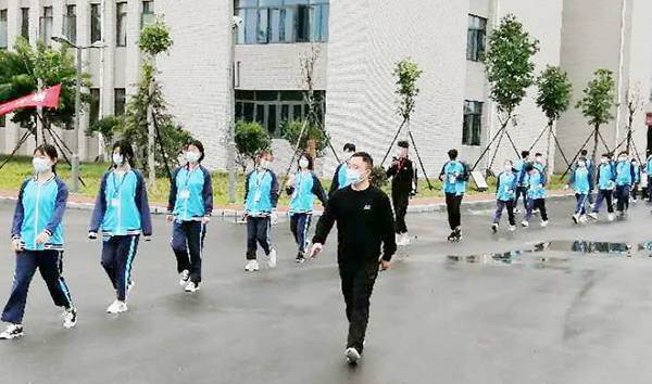 学生管理工作人员对学生进行进行集中应急处置演练,熟悉线下开课后学生一日常规的各项规定动作。