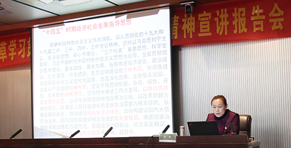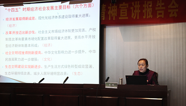 张艳在宣讲报告中重点围绕深刻认识我国进入新发展阶段的重大意义,准确把握2035年远景目标和“十四五”时期我国发展的指导方针、主要目标、重点任务,牢牢把握构建新发展格局的战略构想和重要着力点,坚持党的全面领导、动员各方面力量团结奋斗等四个方面对全会精神进行了详细地宣讲解读。