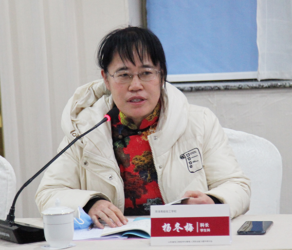 会上,济南市技师学院学工处处长李秀玲、聊城技师学院学工处处长王玉梅、山东交通技师学院学工处处长朱洪涛、德州市技师学院学工处处长刘宏杰、山东省教科院评估所王迎新分别从班主任工作室建设、班主任青蓝工程建设、学生管理工作、学生管理专业理论水平提升等方面进行了经验分享。