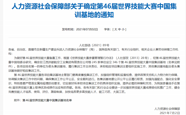 近日,从《人力资源社会保障部关于确定第46届世界技能大赛中国集训基地的通知》(人社部函〔2021〕89号)获悉,我院被确定为第46届世界技能大赛化学实验室技术项目中国集训基地,并作为牵头集训基地,履行集训工作主体责任,承担化学实验室技术项目集训的主要组织实施工作。