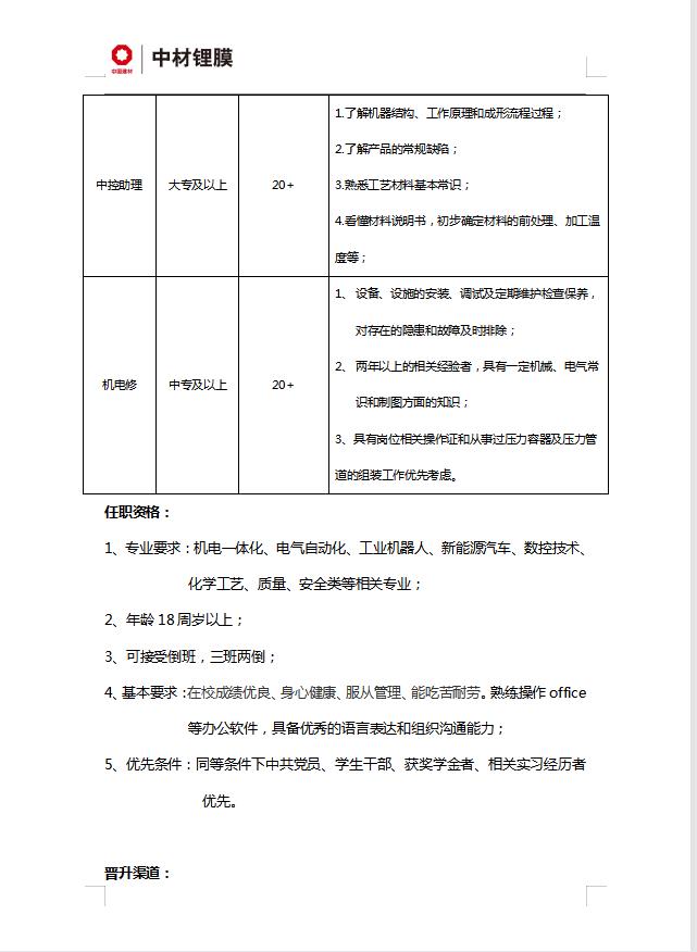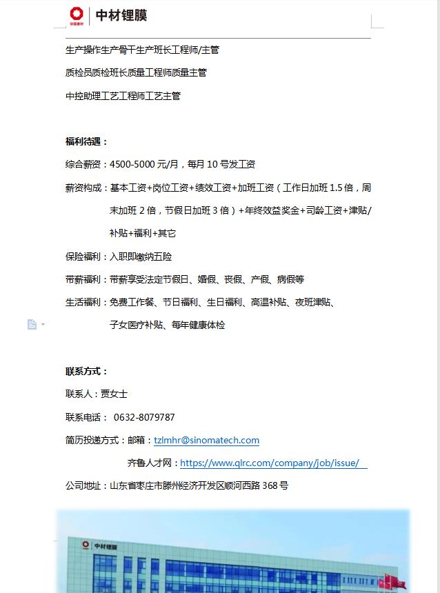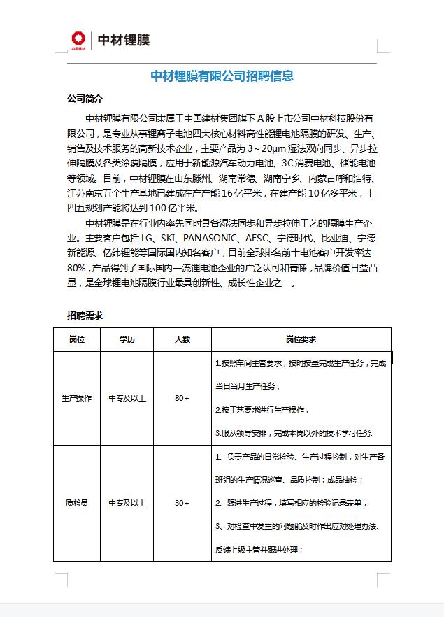 滕州市--中材锂膜有限公司招聘
