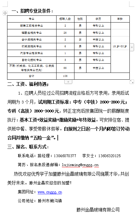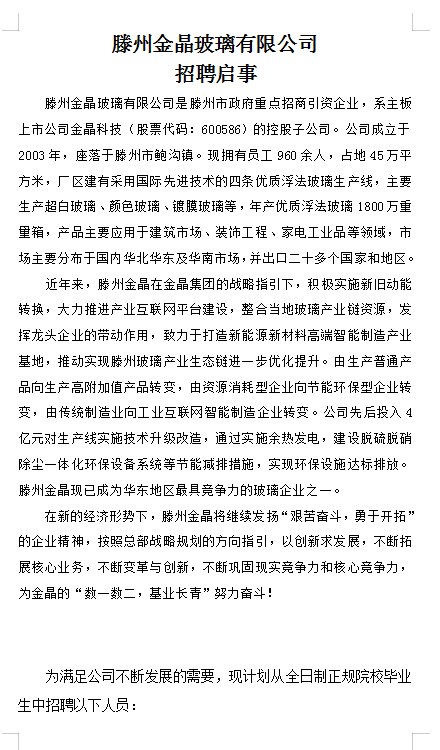 滕州市金晶玻璃有限公司招聘简章