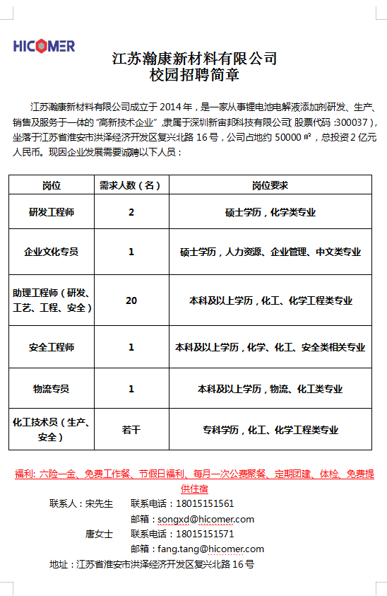江苏瀚康新材料有限公司 校园招聘简章