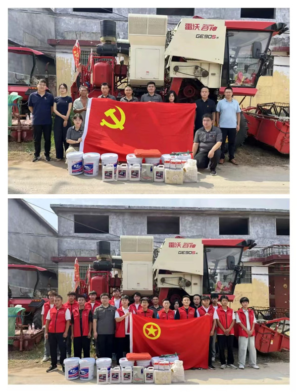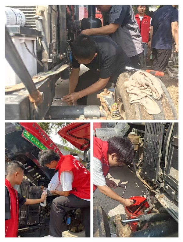 抵达大养德农机站后,团队首先与负责人沟通,了解到因农机长期闲置,部分设备车况不佳,亟需专业维护保养。针对这一迫切需求,团队依托车辆结构、维修保养、故障诊断等核心专业优势,迅速明确分工——党员带头示范,全员协作上阵,对多台农用机械逐一开展检测维修,更换老化机油与滤清器,成功排除潜在安全隐患,为即将到来的秋收工作夯实设备基础。