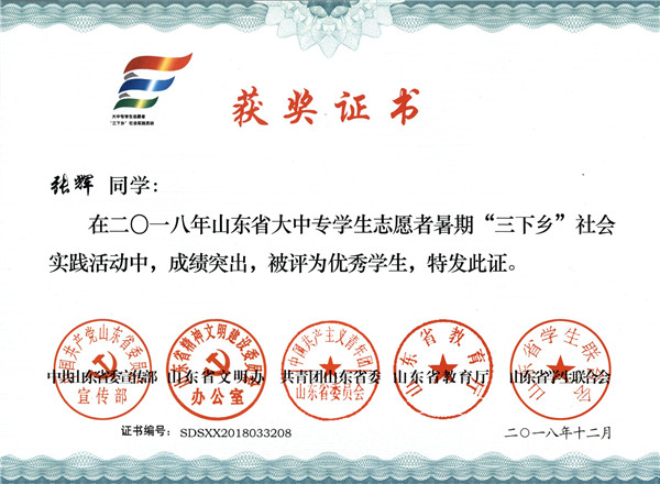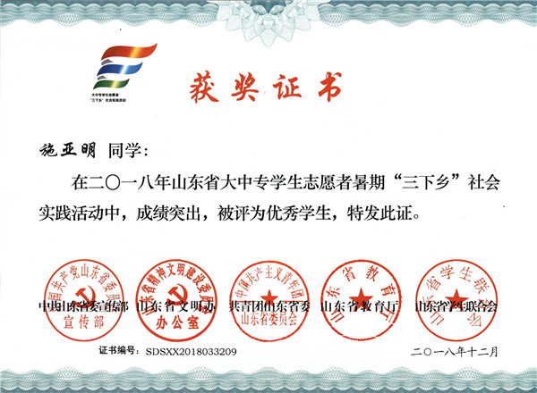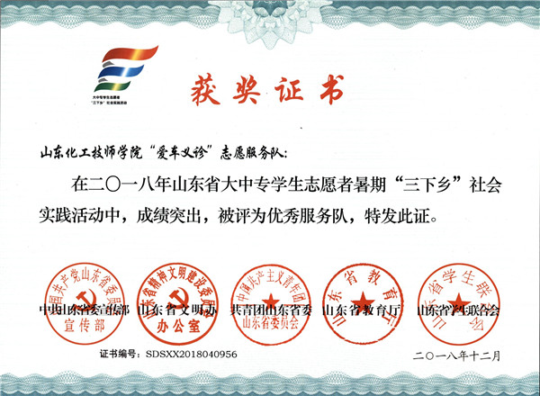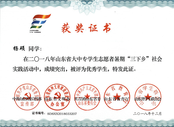 近日,中共山东省委、省文明办、共青团山东省委等5部门联合颁发的2018年山东省大中专学生志愿者暑期“三下乡”实践活动评比中,我系“爱车义诊”志愿服务队被评为省级优秀服务队。杨硕、张辉、施亚明三名同学被评为志愿服务优秀学生。