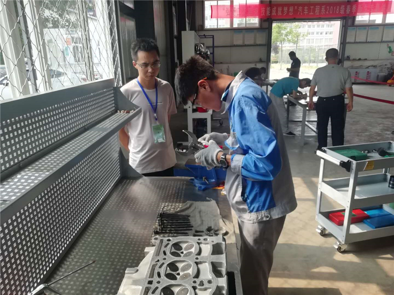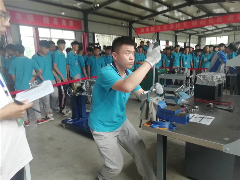 在汽车发动机拆装与检测模块中,参赛选手对活塞连杆组进行了拆装与检测。在拆装过程中,虽然汗水湿透了衣服,但是同学们手上的动作依然没有停止,按照维修手册的要求,规范的完成拆装。