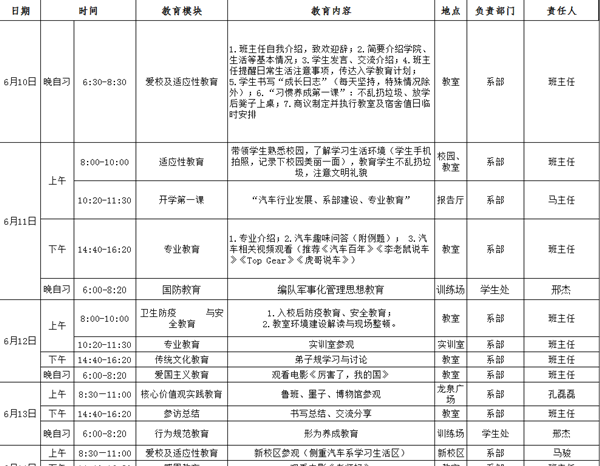 入学教育是新生入校后接触本专业、本系部的第一课,可以让新同学尽快了解、适应系部教学与管理,树立新的奋斗目标,顺利实现从中学到我院的平稳过渡。汽车工程系精心制作了入学教育方案,举办了丰富多彩的新生入学教育活动,帮助新生顺利开启美好新征程。