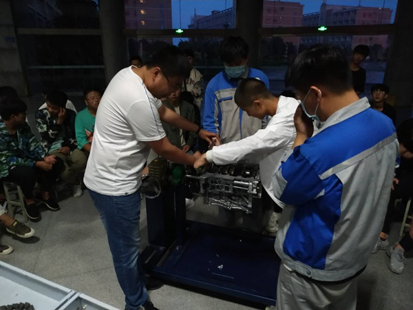 王广磊分享了自己的学习经验,通俗易懂的介绍了来这所学校的目的、来学校后学什么做什么、学习的方法和经验,着重讲解了技能训练、大赛集训的历程。随后,王广磊现场展示了发动机拆装与检测技术,拆卸速度之快、技术之娴熟,令人咋舌,在王广磊同学展示期间,新生踊跃发言,气氛高涨。