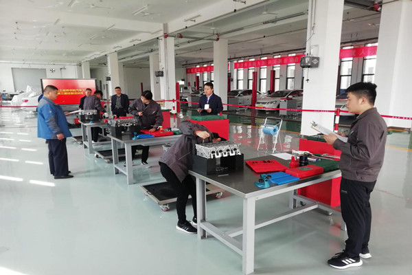 比赛于4月14日在汽车工程系一楼实训车间举行。马主任亲自在现场进行督导。参赛教师共10人分为四组,每个工位由两位老教师担任裁判。比赛开始后,老师们立刻进入状态,按照平时练习的步骤,检查工具,擦拭工作台,拆卸和测量,有条不紊地操作起来......