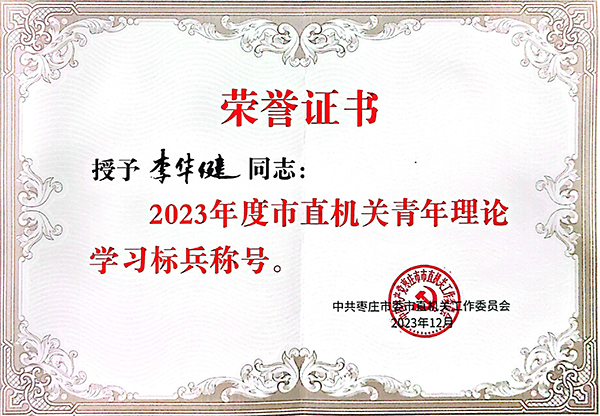 12 月 29 日, 2023 年度市直机关青年理论学习工作总结会议暨第七期青年理论学习大讲堂在枣庄市政大厦二楼报告厅举行,会议表彰了获奖集体和个人,我院荣获理论学习先进集体,李华健老师荣获学习标兵。