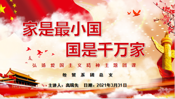 3月31日,在学院路校区二楼201室,经贸系团总支组织开展2021年度第一期团课--弘扬爱国主义精神主题团课。本次团课的主讲人是经贸系团总支书记高瑞先老师,本次团课主要面向本系部所有团员学生开展。