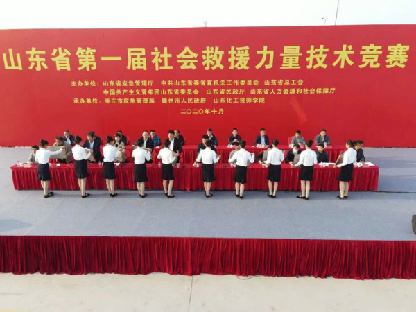 10月19日下午,山东省第一届社会救援力量技术竞赛闭幕式在我院应急救援场地举行。本次大赛礼仪颁奖人员是在德育处统一组织协调下,由校礼仪社选派,通过层层选拔,来自化学工程学院、分析与检测技术系、机械工程学院的20名优秀学生脱颖而出。