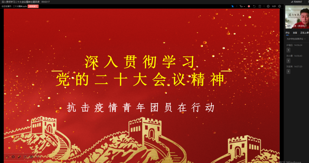 在此次线上团课学习中,团员学生备受鼓舞,纷纷表示,将带头学习和贯彻党的二十大精神,牢记习近平总书记的嘱托,在党的领导下,以理想者、担当者、吃苦者、奋斗者的姿态,奋进新征程,诠释新青春,创造新成绩!用实际行动为抗击新冠疫情做贡献,以精湛的技能为社会主义建设增砖添瓦!
