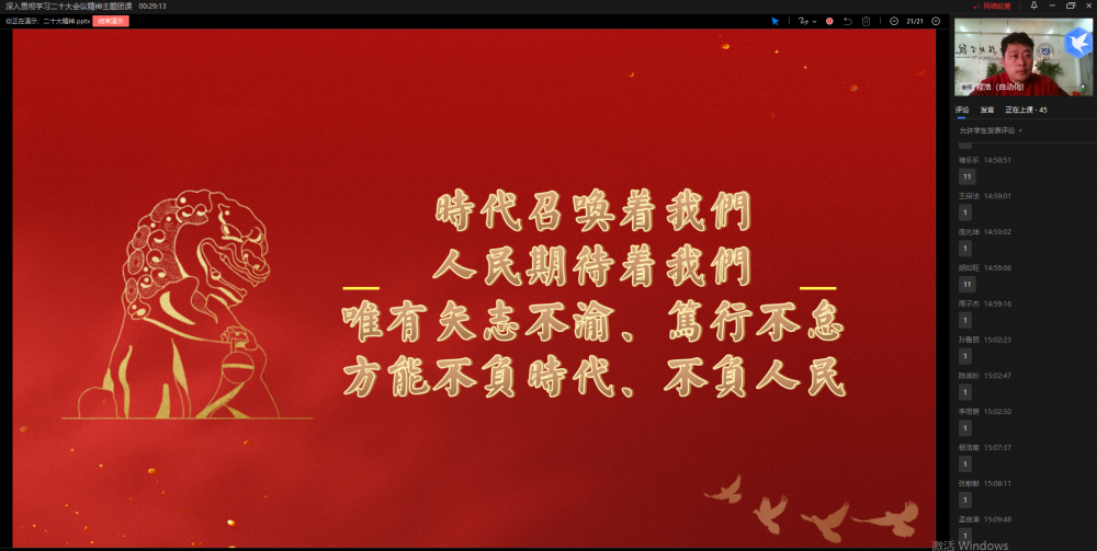 10月29日,智能控制与自动化系团总支利用周末时间开展线上主题团课,深入贯彻学习二十大会议精神。自动化系全体团员参与了线上学习。