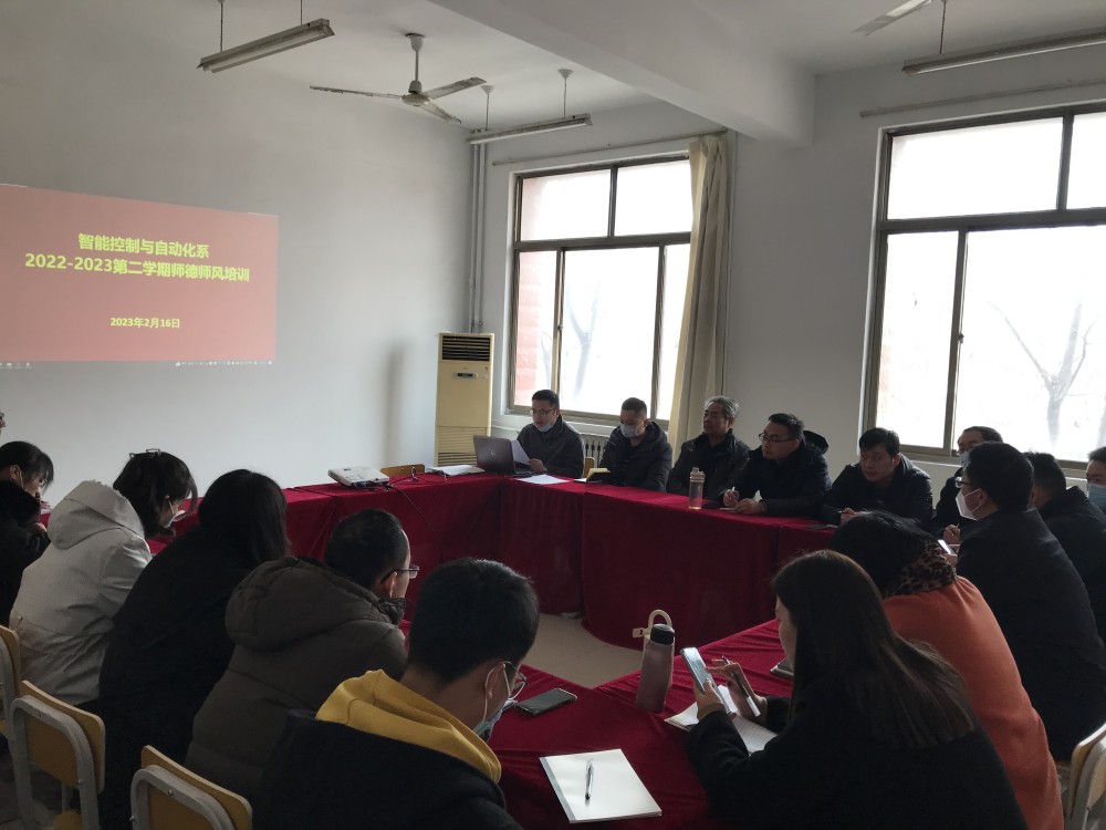 为全面贯彻习近平总书记关于教育的重要论述和教师队伍建设的重要指示精神,坚持师德师风第一标准,进一步加强我校教师思想政治和师德师风常态化建设;引导广大教师严格遵守师德规范、弘扬高尚师德,不忘从教初心、潜心教书育人,切实担当为党育人、为国育才的光荣使命。2023年2月16日下午3点,智能控制与自动化系组织了全体教师的师德师风培训。