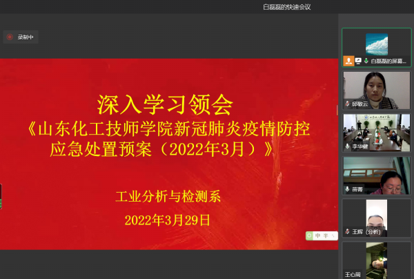 为进一步提高系部师生应对校园突发新冠疫情应急处置能力,3月29日,工业分析与检测系召开专题学习视频会议。系部领导、封闭管理的校内专班教师、各班班干部到会参加,其余教师通过视频会议参加学习,深入学习领会《山东化工技师学院新冠肺炎疫情防控应急处置预案(2022年3月)》,会议由工业分析与检测系副主任白磊磊主持。