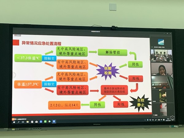 白磊磊详细讲解山东化工技师学院异常情况应急处置流程以及配合滕州市新冠肺炎疫情应急处置指挥部和疾控中心开展应急处置工作的具体安排。重点强调异常情况应急处置中流程中的校门应急处置预案、教学区应急预案、餐厅就餐应急预案、宿舍应急预案四个部分。