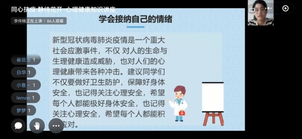 引导居家学习学生管理。学院实行封闭管理后,系部立刻安排“疫情防控心理健康”主题班会,为学生讲解疫情防控期间的心理调适、学习规划和时间管理方法,调动学生学习积极性。此外,班主任们经常性了解学生居家学习等情况,家校一体化育人,为学生“心理健康”保驾护航。
