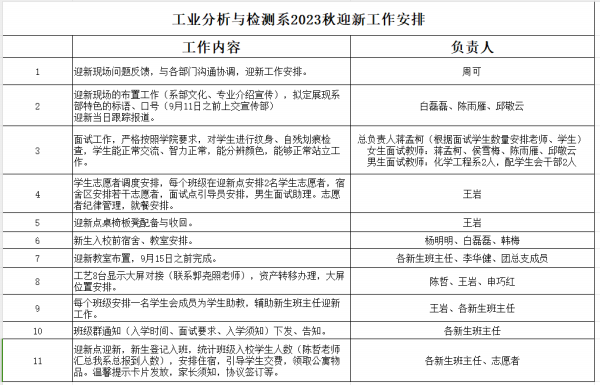 辞夏迎新秋,万象启新篇。为确保2023级新生顺利入校,各项工作有序开展,工业分析与检测系9月13日上午召开迎新工作专题会。系主任杨明明、党支部书记周可,系副主任白磊磊及分管学生、团委、2023级全体班主任参加本次会议。