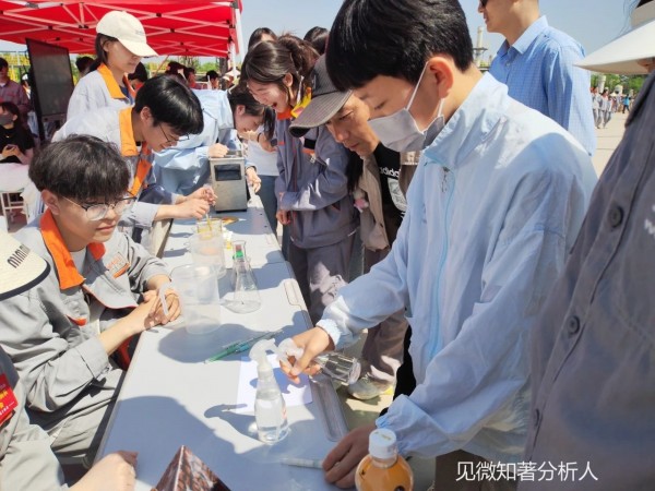 系部老师及学生现场演示“秘密书信”、“可乐变雪碧”、“黄金雨”等趣味化学实验,家长朋友们也纷纷动手参与实验,有趣的实验现象令人印象深刻,深受大家喜欢。