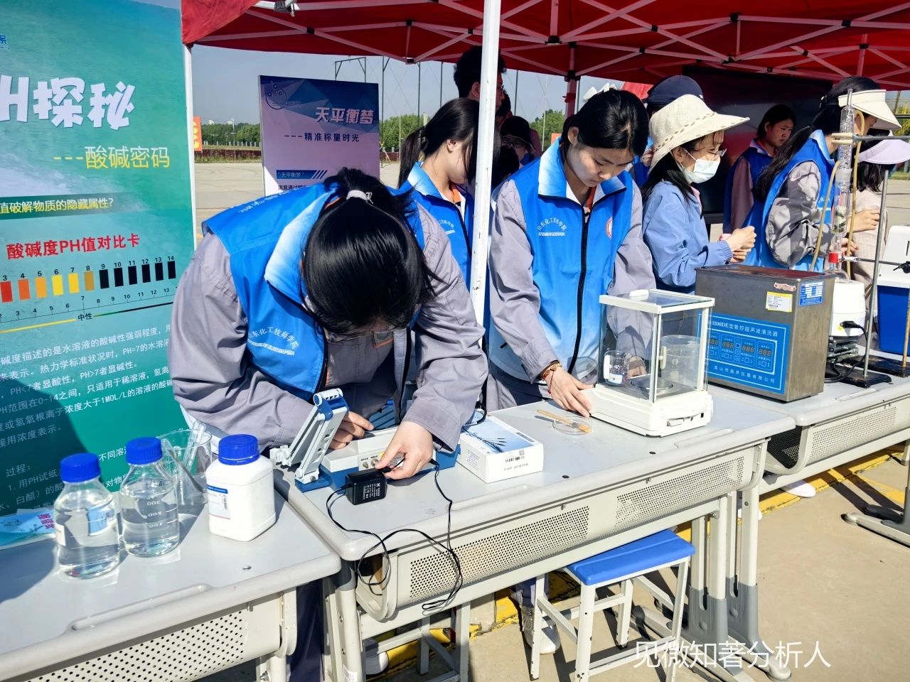 实验仪器展示区设置了“超声净界:微观焕新之旅”和“天平衡梦:精准称量时光”等项目,现场放置了万分之一分析天平、超声波清洗器、酸度计、索氏提取器等先进仪器。工作人员不仅为师生、家长清洗眼镜、首饰,还详细讲解仪器的工作原理及在实际生产中的应用。参与者通过亲身体验,对化工分析与检测的先进技术有了更深入的认识,感受到专业技术在生活和生产中的重要价值。