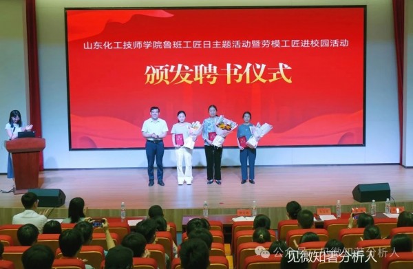 为庆祝枣庄市第二个“鲁班工匠日”,将劳模精神、劳动精神、工匠精神深度融入技工教育,搭建校企合作平台,推动产教融合,强化学生职业素养和价值观教育,激励广大师生传承匠心、精进技能,激发学生技能报国热情,培养精益求精的职业态度。6月10日,由学院工会主办的“鲁班工匠日主题活动暨劳模工匠进校园”系列活动拉开帷幕。本次活动由工业分析与检测系承办。学院党委副书记、院长伊文涛出席活动。相关职能处室、各系部代表以及鲁班工匠实验班、山能订单班、联泓订单班学生共同参与。我院优秀毕业生代表:兖矿鲁南化工有限公司朱玉英、联泓新材料科技股份有限公司李芸、兖矿鲁南化工有限公司侯文静作为特邀嘉宾参加本次活动。活动通过先进工匠事迹分享、互动实践、未来工匠宣誓等形式,为师生带来了一场别开生面的“匠心课堂”。