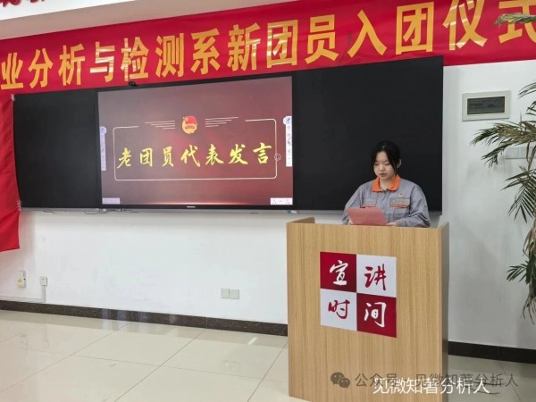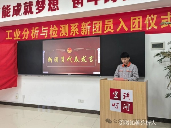 新团员代表张秀瑞发言,他代表全体新团员感谢学校和老师的悉心培养,坦言入团既是荣誉更是责任。他表示,未来将立足分析专业,磨砺技能、严守团员标准,在学习中精益求精,在生活中践行义务,以青春之力为祖国发展贡献力量。