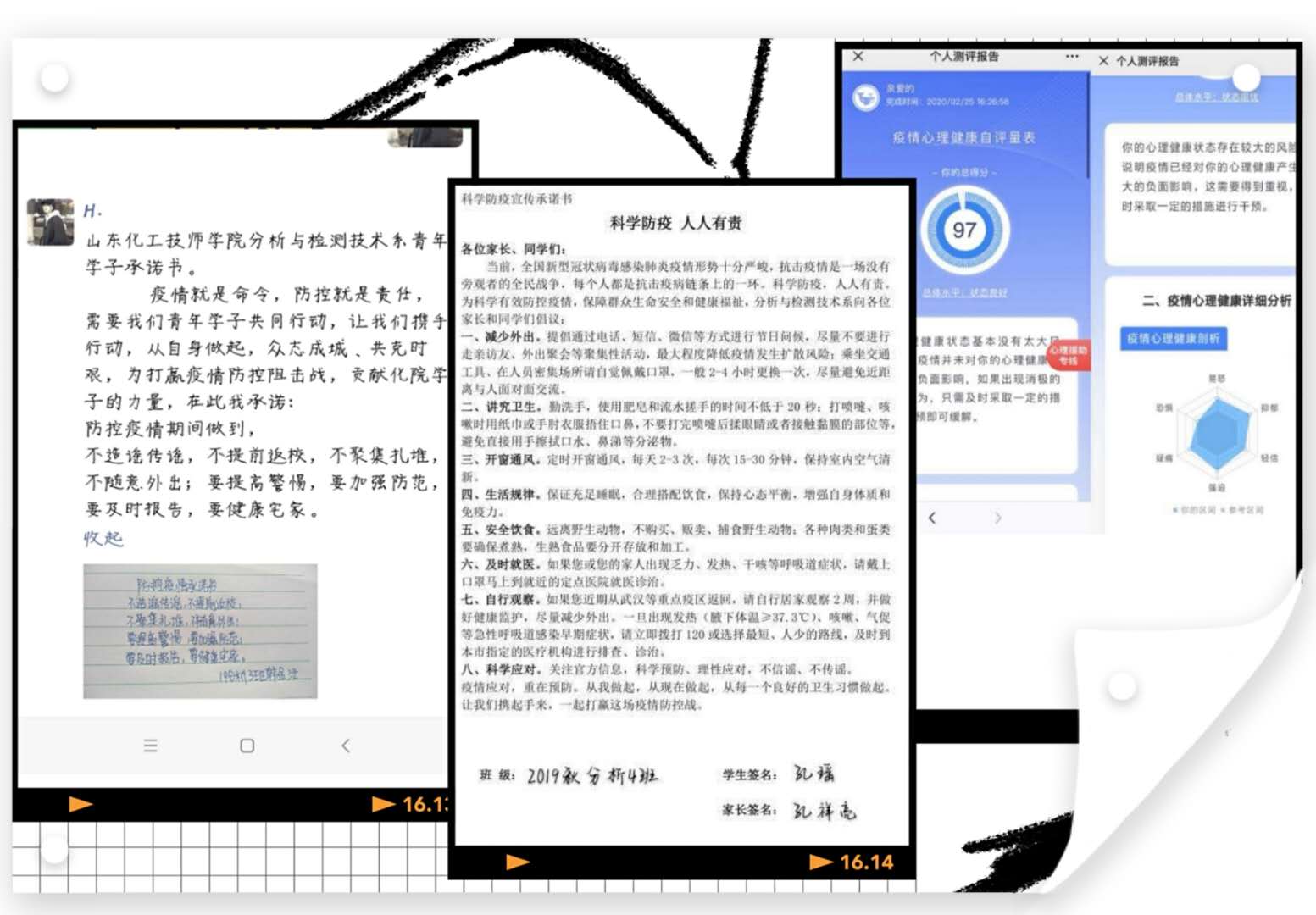 第四部分为 “抗击疫情,你我同行”。 为了更好的引导团员青年遵守学校关于疫情防控工作的相关规定,做好疫情防控期间的各项自我排查。自我防护工作,开展“防控疫情我承诺”活动,各班级组织团员自觉签署防控疫情期间承诺书:“不造谣传谣、不提前返校、不聚集扎堆、不随意外出。要提高警惕,要加强防范,要及时报告,要健康宅家。”各位同学手写承诺书内容,并签署个人名字,转发朋友圈,影响身边的朋友一起共同抗击疫情。