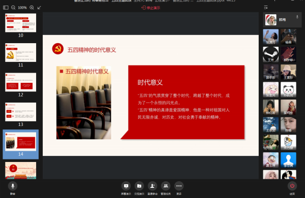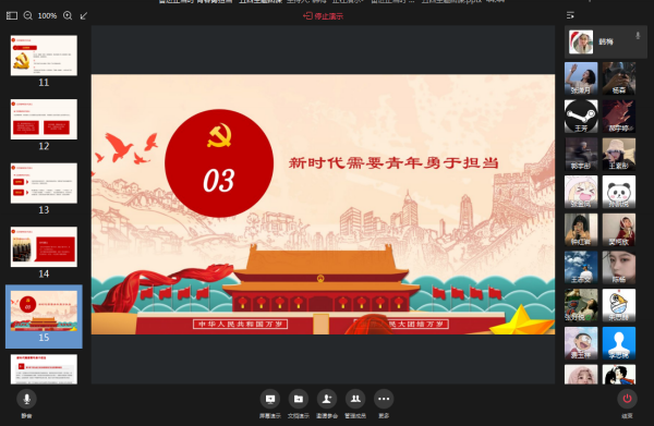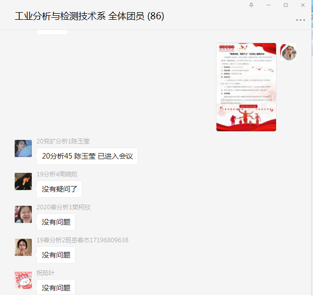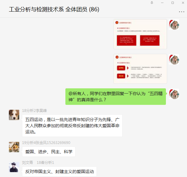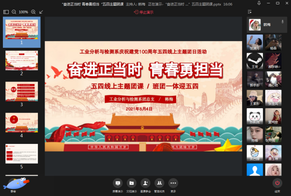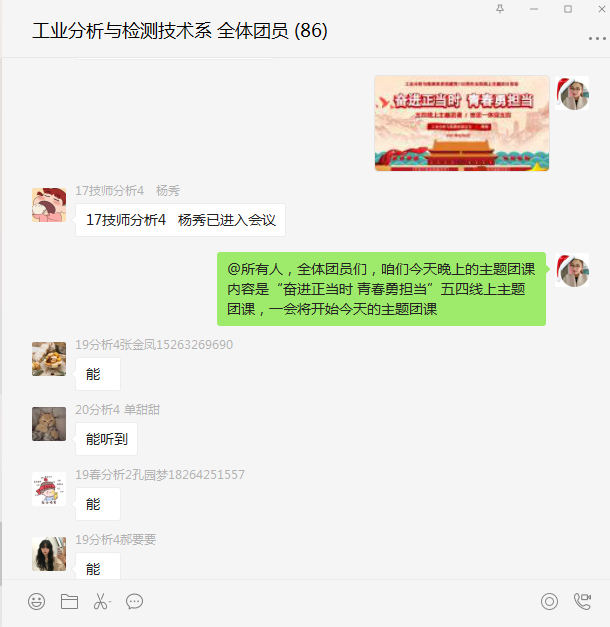 为进一步加强对新、老团员的培养、教育和考察,帮助团员深入学习团的理论知识和团的职责,增加他们对共青团的荣誉感,积极传递青春正能量,工业分析与检测系团委书记韩梅于5月3日晚上七点,在线上召开了一次“奋进正当时 青春勇担当”的主体团课。团课主要分为“什么是五四精神”、“五四精神时代内涵和意义”、“新时代需要青年勇于担当”、“疫情下青年担当”和“展未来,砥砺前行”五个方面。团课上,韩老师借助一个个立意鲜明的提问,带领团员们对新时代赋予自己的责任进行了梳理。