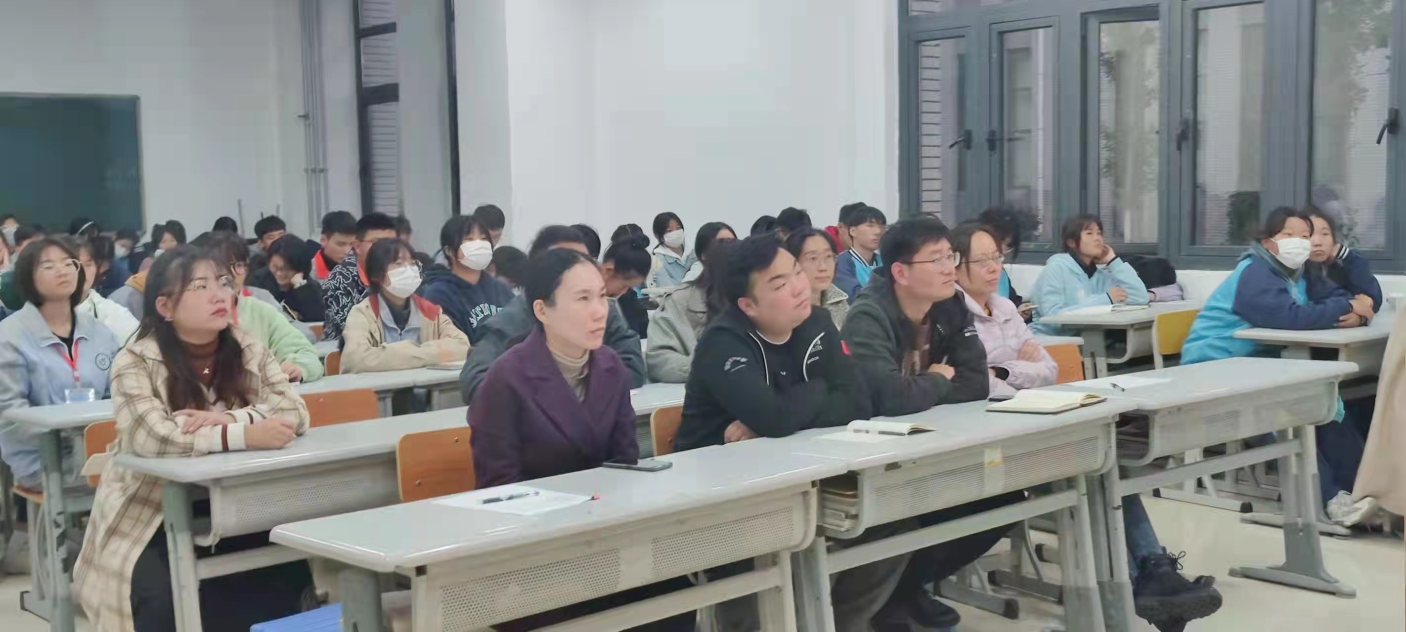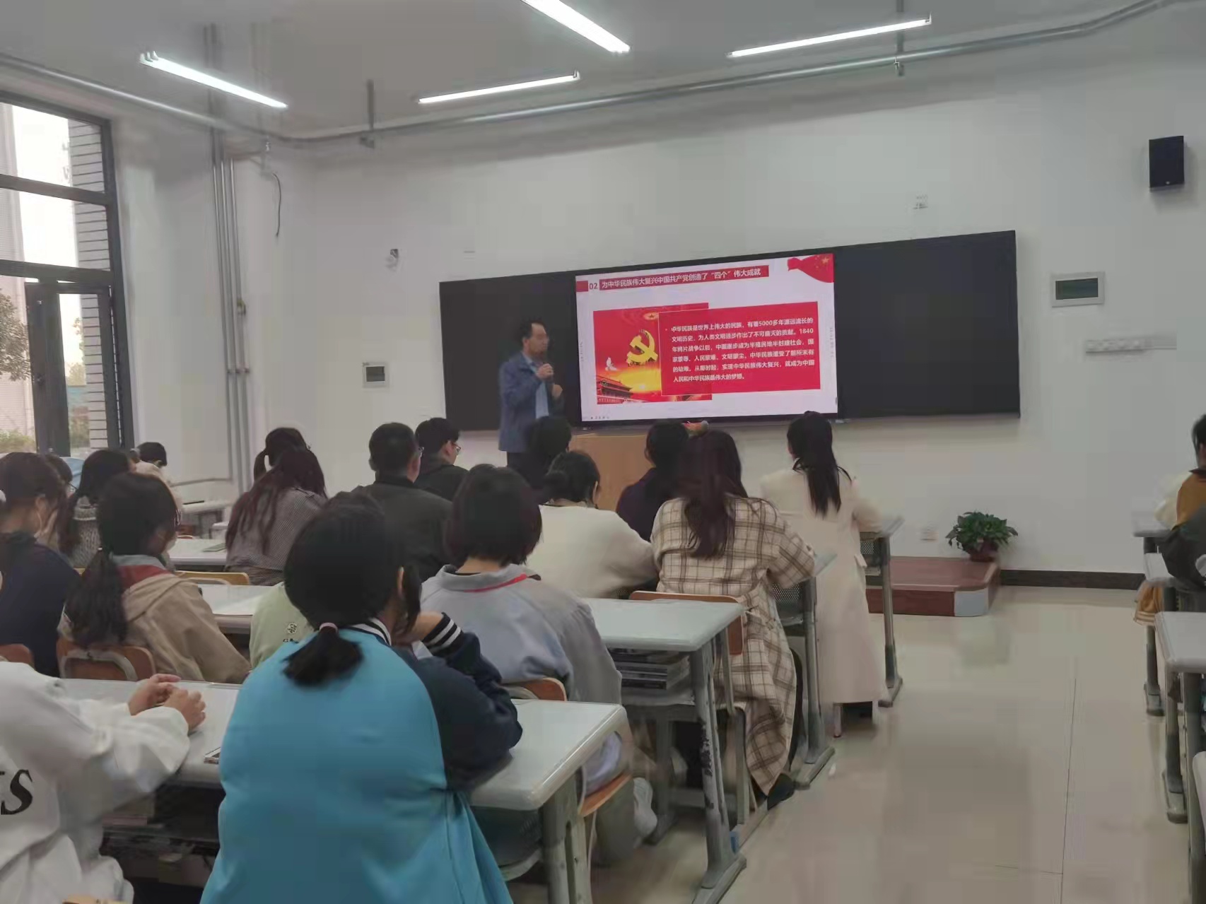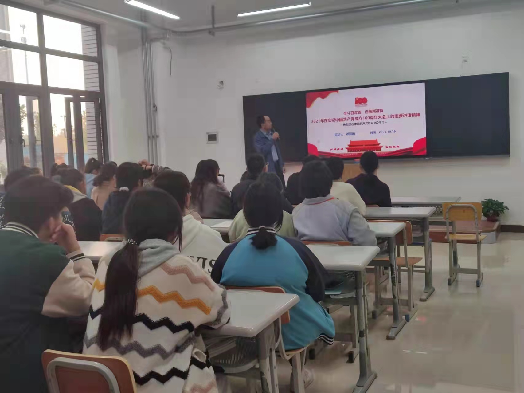 10月14日下午四点二十分,工业分析与检测系和教育与公共服务系35周岁以内的教师以及两个系的学生班委在分析楼A123参加了徐廷国老师的“伟大抗议精神”党史学习教育宣讲。