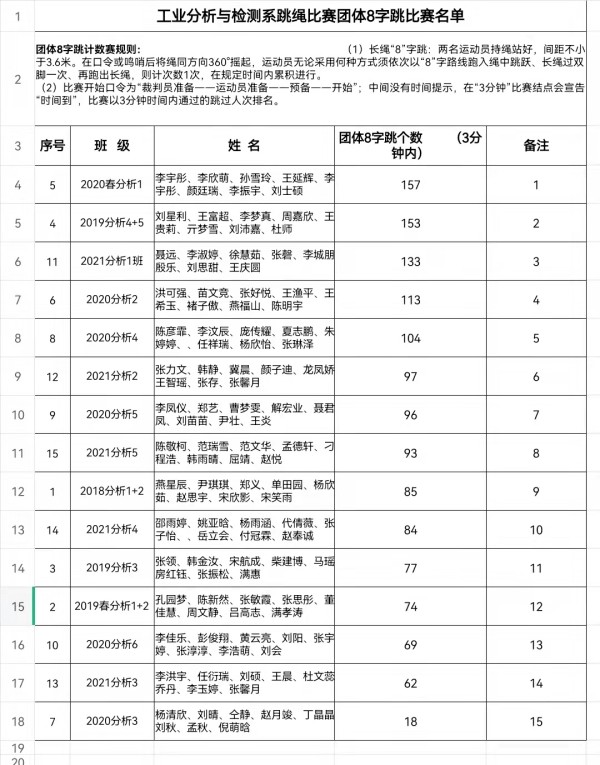 为丰富分析系学生课外活动生活,吸引广大青少年学生走进阳光下,锻炼自己身体,增强学生体质,丰富校园文化;提高运动能力,提高运动兴趣,提高集体凝聚力,工业分析与检测系特设置“绳彩飞扬 健康你我”跳绳比赛活动项目,以培养学生的团队合作精神,促进大家的相互交流。系部杨主任和各班班主任到现场担任监督员,同时为班级学生加油助威。