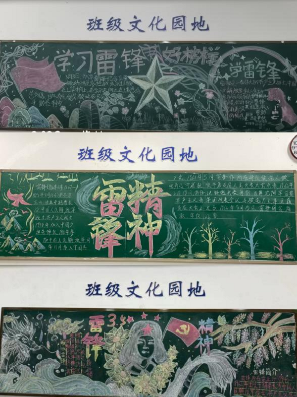 系列活动三学雷锋主题黑板报、文化墙展评活动。通过教室后黑板、文化墙、手抄报展示走近雷锋,交流心得,学习雷锋精神,坚定理想信念,勇于承担社会责任,让爱心在行动中成长,习惯在行动中养成,责任在行动中履行。