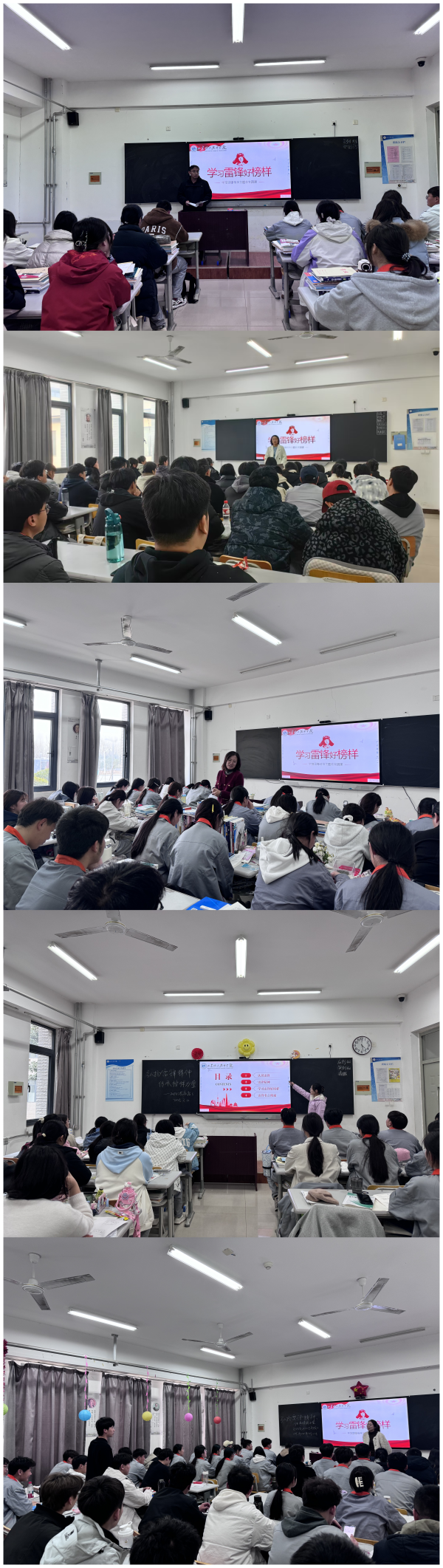 各班级以“雷锋故事”为切入点,通过纪录片展播、雷锋日记诵读、榜样事迹分享等等形式,生动诠释雷锋精神的内涵,引导学生要以雷锋为榜样,用实际行动点燃青春的激情与梦想。