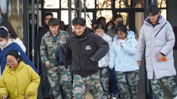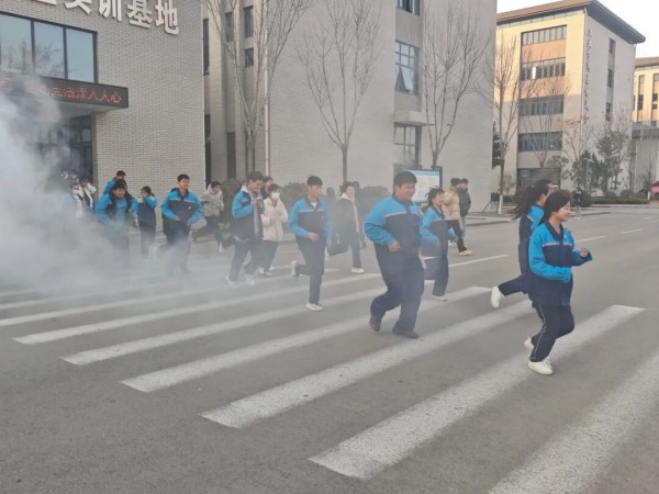 15:50,尖锐的警笛声划破教学楼的宁静,疏散演练正式启动。各班学生迅速响应,以湿巾捂住口鼻、弯腰低姿前行,在班主任及楼层引导员的指挥下,沿预定路线分期分批撤离。各楼层楼梯口的引导员全程值守,密切关注疏散秩序,确保无拥挤、推搡情况发生。整个过程衔接顺畅、反应迅速,仅用4分20秒便完成全体师生向安全区域的集结。