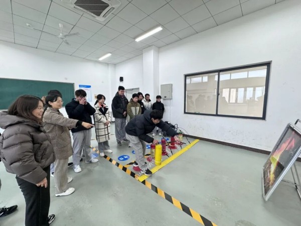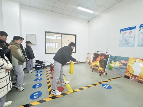 疏散演练后,灭火演练环节结合化工场景火灾特点,教师讲解不同场景下灭火器的使用,现场示范干粉灭火器“提、拔、握、压”四步操作法。学生面对模拟火源正确选择灭火器,规范完成灭火动作,切实将理论知识转化为实战能力。