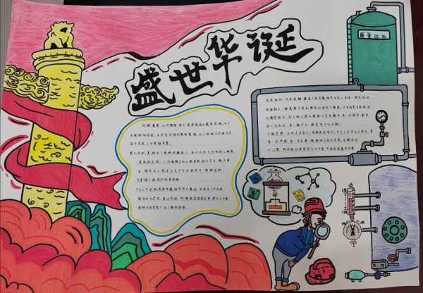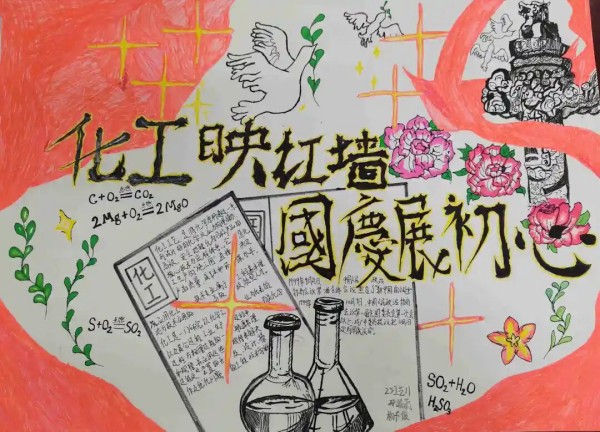 同学们以 “红色华诞” 为魂、“化工科技” 为笔,将五星红旗、华表等元素与化工设备、化学符号巧妙融合,既展现对祖国的深情祝福,又科普化工在能源保障、新材料研发中的重要作用,让“爱国情”与“专业志”在色彩与知识中同频共振。